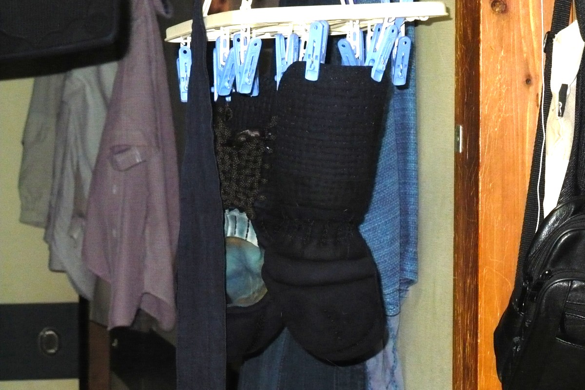 小手は最初、洗濯レールで写真のように干してみたのですが、小手頭を上に干したほうが良い、とご指摘をいただきましたのでアレコレ考え、最終的に使用したのは・・・